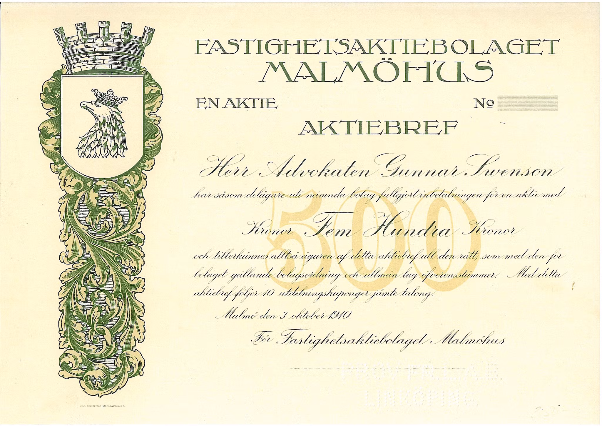 Fastighets AB Malmöhus, 500 kr, 1910, Malmö, tryckprov, Utst. Herr Advokaten Gunnar Swenson, Bransch: Fastighet, RSA:1623, storlek 26,5 x 19 cm.