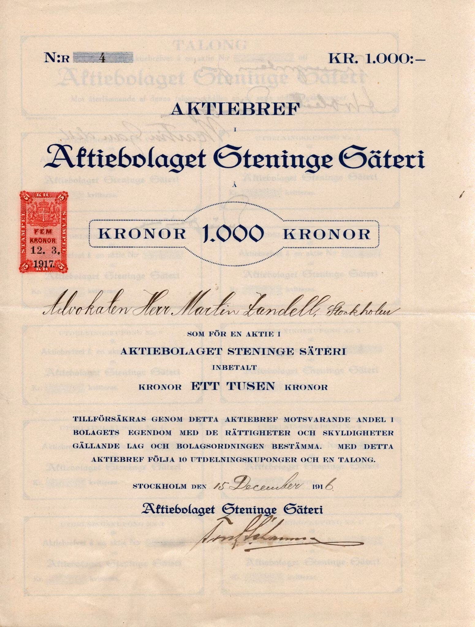 Steninge Säteri, AB, 1000 kr, 1916, Stockholm, Utställd på advokat Herr Martin Landell, Bransch: Lantbruk, RSA:6192, storlek 22 x 28 cm, lätt vikt. med kuponger.